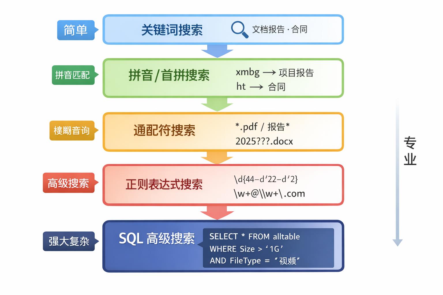 支持首拼、全拼、通配符混合搜索,中文文件查找更便捷。